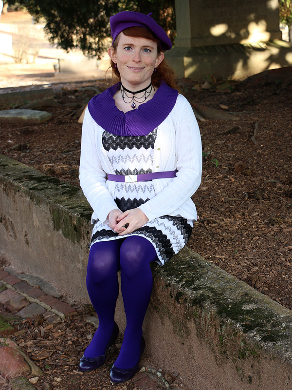 I've worn this scarf, belt, and pair of earrings on the blog a number of times before and even the beret and necklace once each. And now I've added these purple tights and wedges to my wardrobe as well. Be prepared for a lot more purple outfits to come. (Though, as of writing, I've finally picked up a few great green items too!)