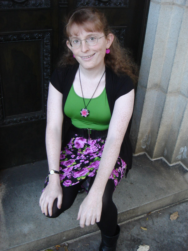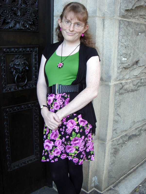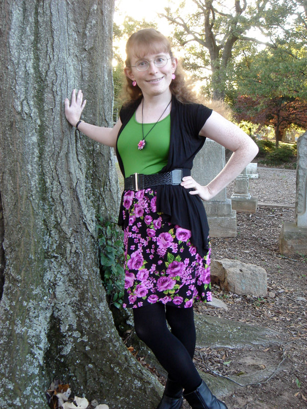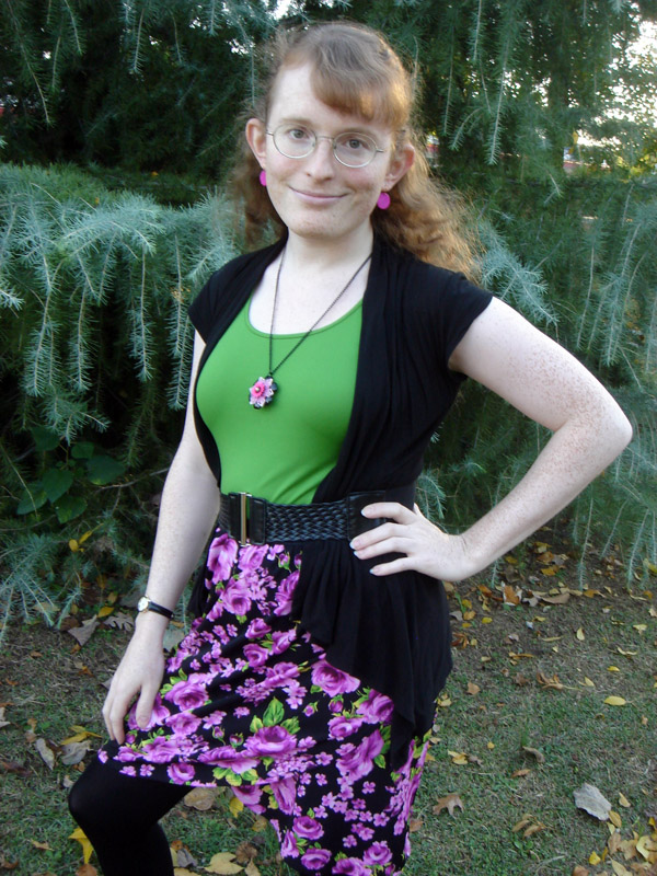 I bought this tanktop because I wanted a comfortable green tanktop and it was the best I could find at the time. But the unappealing shade kept me from wearing it for two years. I probably would have gotten rid of it by now, but when going through all my clothing looking for matches to the colors in the skirt, I found that it was the only piece I had that matched the leaves. I've almost always used it with this skirt ever since.