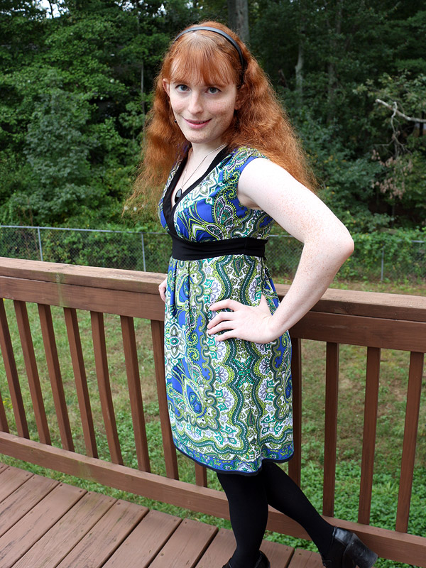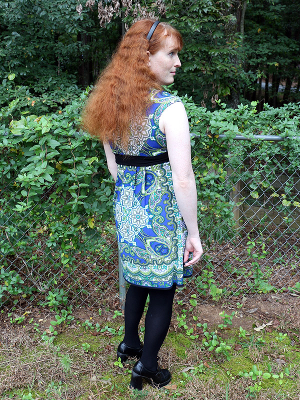This was the first of my black banded Macy's dresses. I bought it even though I wasn't wearing dresses very often at the time, as I was quite taken with the pattern. I wore it not long after that, struggling to tie a neat bow in the back. Then I ended up riding in a car for a couple of hours, with the knot pressing painfully into my spine the entire time. I set the dress aside as a bad idea and only revisited it recently, when I was evaluating clothes to keep or give away. I altered it the same way I did this one, allowing me to start wearing it again.