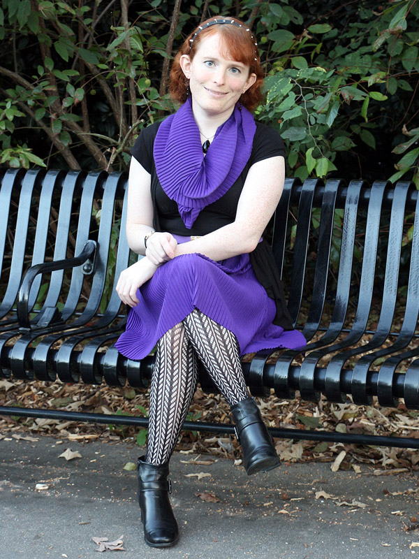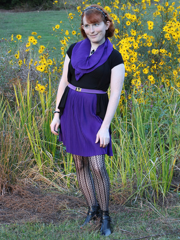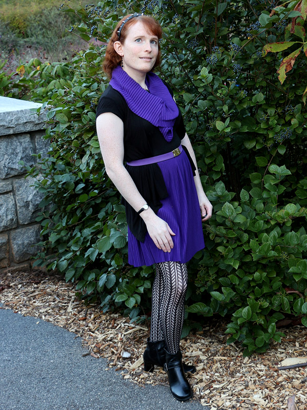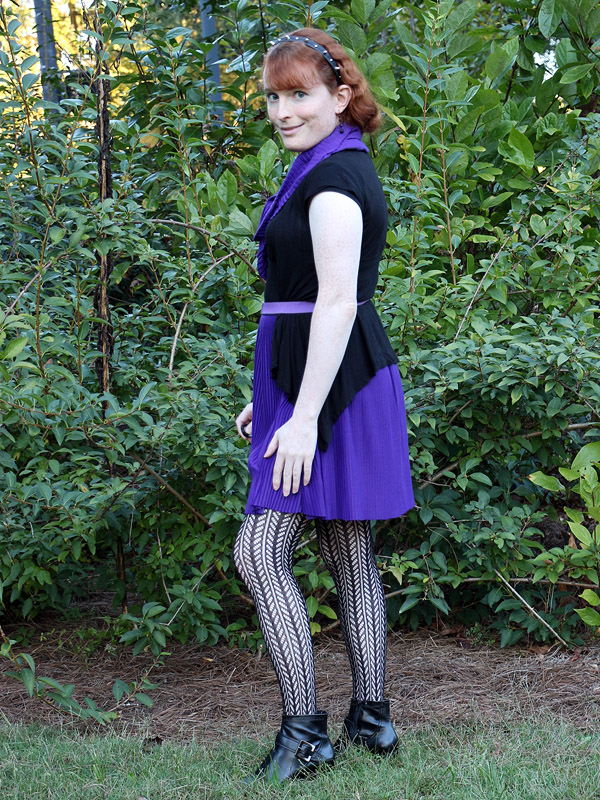 My scarf, made from the severed bottom of the skirt and looped three times around my neck, can be a little fussy. I set it aside for a few months because it kept looking rumpled, but I finally learned how to spread the upper layer of the scarf reasonably smoothly across my chest. But right after this photoshoot, I noticed a little wad of the other layers hanging out the bottom of upper layer. It only took a moment to tuck away, but there it is, in every picture.