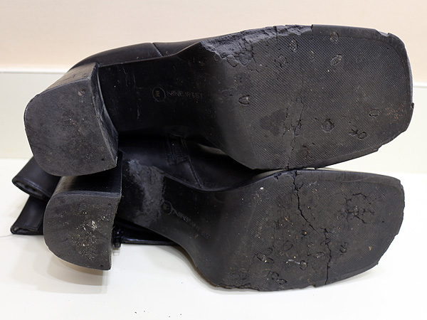 Blackhaw seeds crunched under these boots on the way back and forth from the car Friday and Sunday of the convention. The broken seeds stuck in the soles. I didn't notice them until the soles started to disintegrate. The rubber had become brittle enough, as is often the case with thrift store shoes, that having a bunch of tiny wedges repetitively pounding into the soles under my full weight caused chunks to crack off. The soles were completely intact prior to this and I had worn them multiple times recently without incident. (The damage to the area that doesn't come in contact with the ground was from sitting with the boot heels hooked over the crossbeam of a wooden chair on Sunday of the con.)