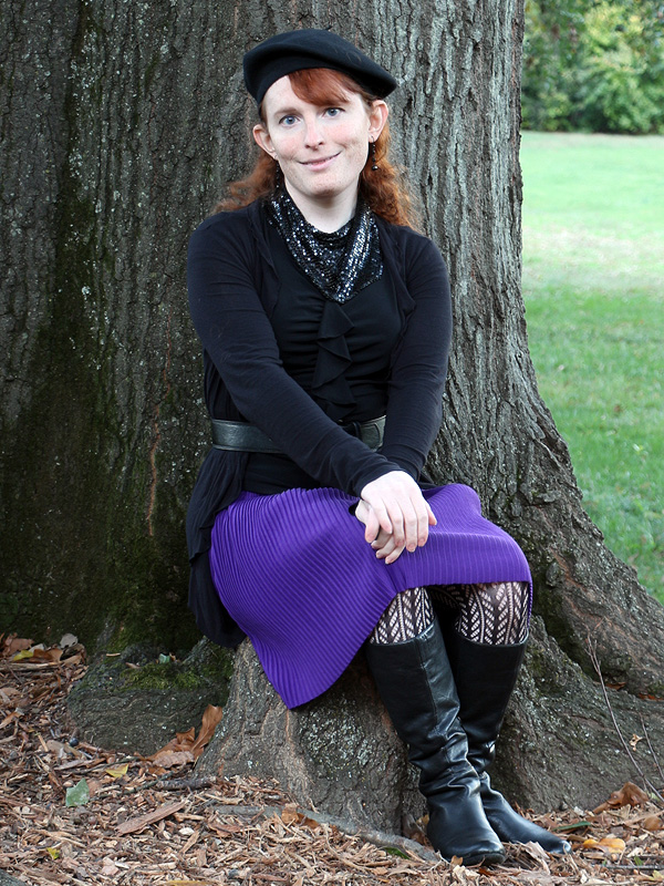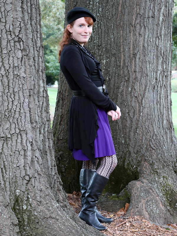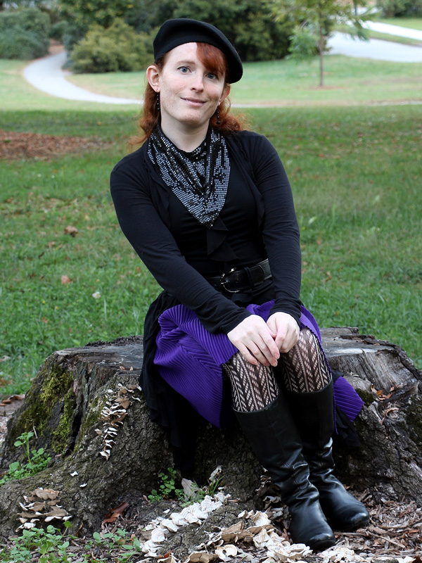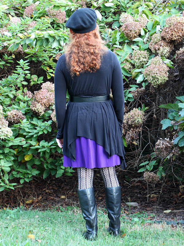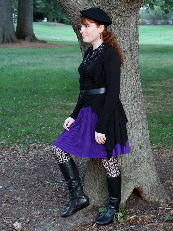 I feel that the neckline of the ruffle front top is a bit lacking, so I wanted to fill it in with a necklace. As you can see from the previous time I wore it on the blog, the necklace has a simple triangular shape. For this occasion, I tucked the edges inside the neckline of my top, then bloused the necklace to make a rounded outline. The effect is not entirely stable, as you can see in the last photo, where the edges have fallen free. But I liked the effect enough that I sewed another piece of black metal mesh into the same folded, rounded shape to make a new necklace.