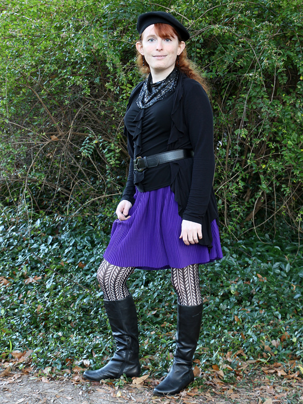I haven't worn this ruffle front top very often, but when I was reviewing it to potentially give away, I noticed a faint resemblance between the ruffles on the front of the top and those along the edges of my Eyeshadow wrap. And so I came to pair them together.