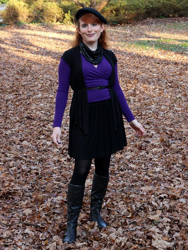 Wearing these two tops together, with a varying bunch of other black clothing, has been one of the most important style combinations in my wardrobe in recent years, though the purple top is nearly worn out at this point. Several of the items from this post were previously worn together in one of my earliest posts. (Looking back, I feel a strong need to apologize for the shortcomings of my old camera!)